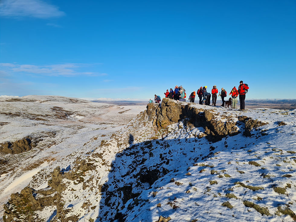 Hópmynd með öllum hópnum hér á hæsta tindi Vörðufells í 414 m hæð: